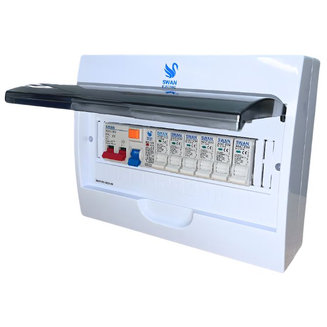 12 WAY PLASTIC SURFACE DISTRIBUTION BOARD, FITTED / POPULATED WITH : ISO – 63A 2P, E/L – 63A 1P + N, MCB, 40A 1P 3KA (x 1)MCB, 20A 1P 3KA (x 3) MCB,10A 1P 3KA (x 2) BB 6 MOD (x 1)+1X LABEL