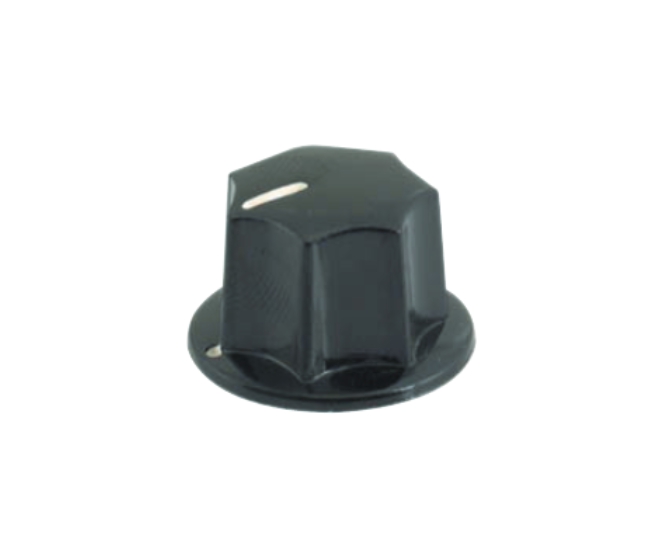 PLASTIC KNOB, 19MM OUTSIDE DIAMETER, BLACK WITH WHITE INDICATOR LINE, FOR 6MM SHAFT, GRUB SCREW TYPE.