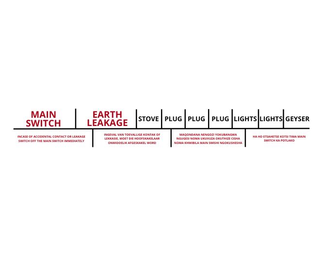 DISTRIBUTION BOARD LABELS - MAIN SWITCH, EARTH LEAKAGE,STOVE,PLUG,PLUG,PLUG,LIGHTS,LIGHTS,GEYSER 197MM x 25MM