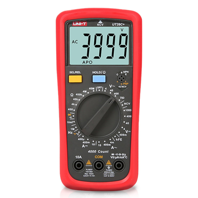 CAT II 1000V/CAT III 600V DESIGN, DIGITAL MULTIMETER 10A AC/DC 750VAC 1000VDC, MEASURES, VOLTAGE , CURRENT, RESISTANCE, CAPACITANCE, FREQUENCY, DIODE, TRANSISTOR, CONTINUITY AND TEMPERATURE.